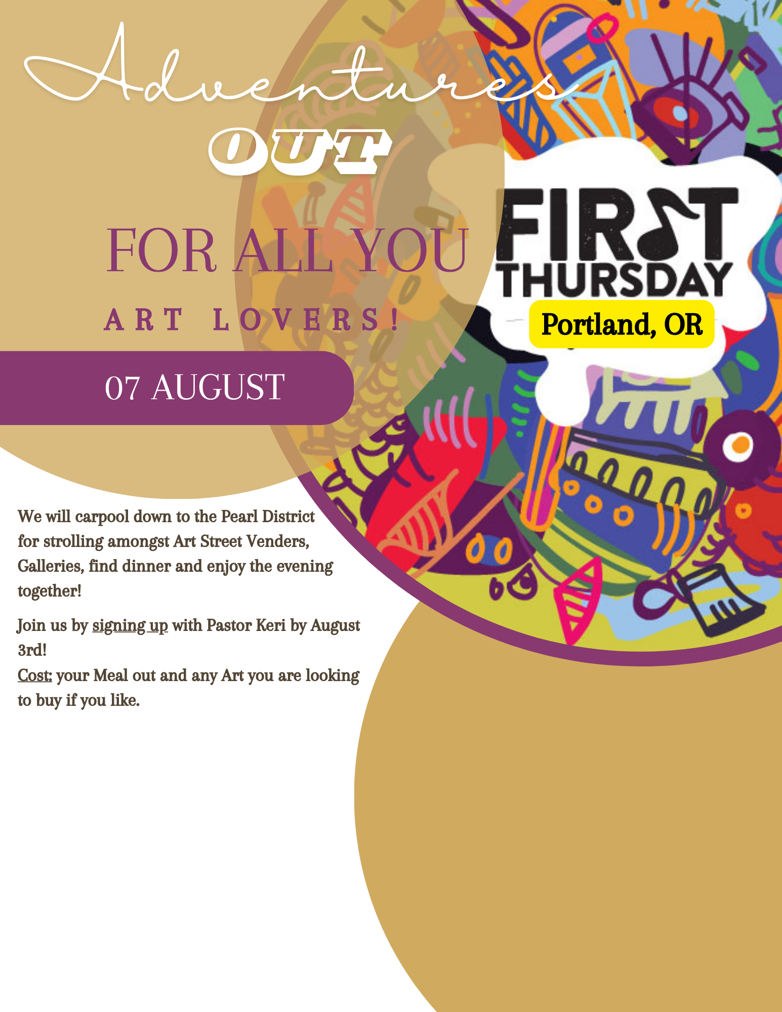 First Thursday is National Art Night where on the first Thursday of each month in major cities the art districts will close their roads and invite Artists, to come to set up Vendor Tents and Street Musicians to come serenade people in the streets. Galleries will stay open later and people will gather in these streets to wander, eat, listen to music and look at Art.